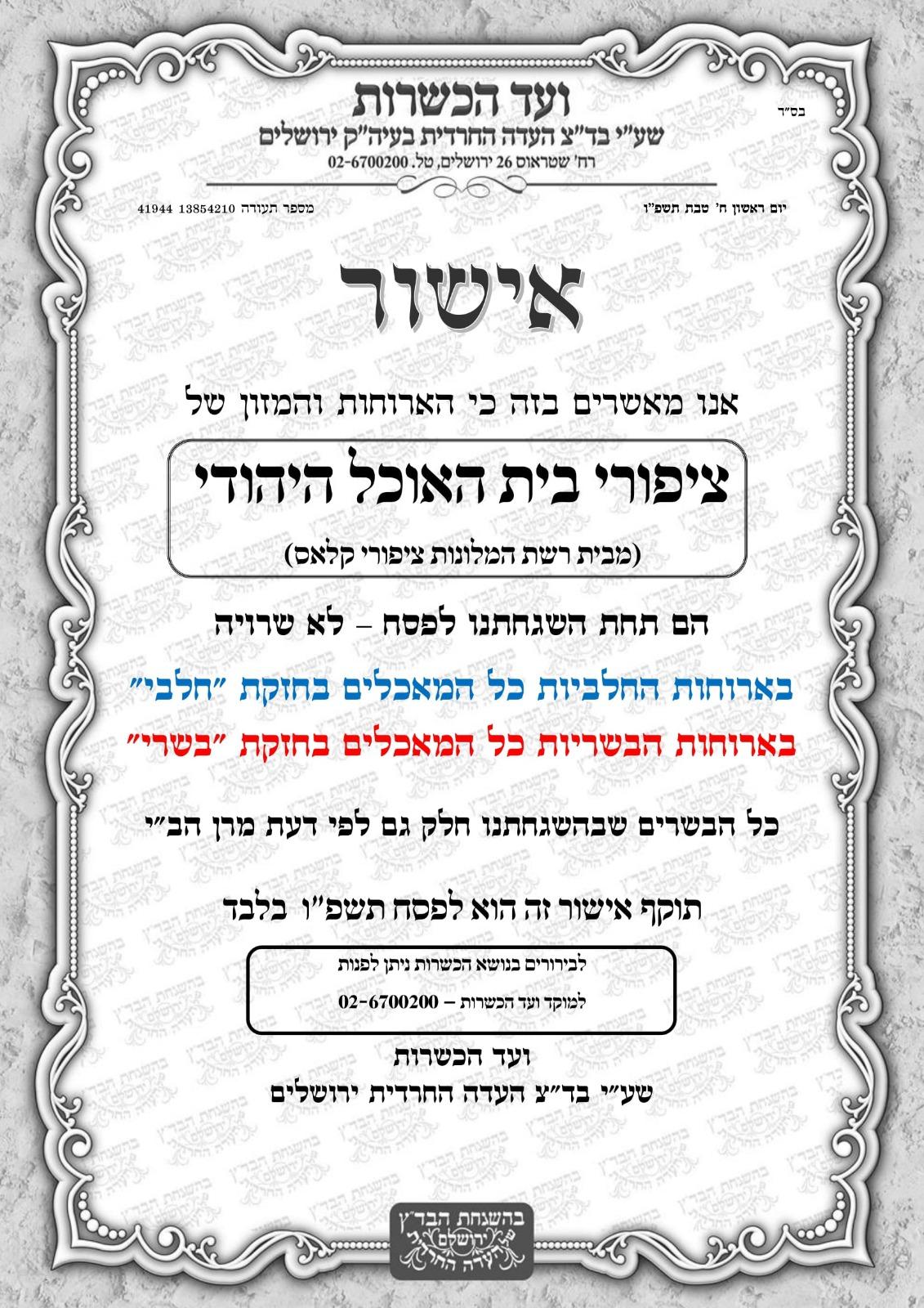 כשר לפסח ללא שרויה, כל המנות בכשרות בד"צ העדה החרדית ומיוצרות בהתאם לכללי הכשרות המחמירים ביותר ללא שרויה וחשש מקטניות.